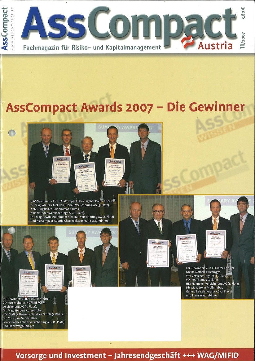 Die AssCompact Awards wurden erstmals 2007 verliehen mit dem Ziel, die besten Versicherer in den jeweiligen Sparten vor den Vorhang zu holen. Die dazugehörige Studie genießt in der Branche hohe Wertschätzung, denn die Gesellschaften schätzen das umfangreiche Feedback, wie die Vertriebspartner die Produkte und Services sehen. „Die Awards kannten wir von AssCompact Deutschland, wo sie bereits als sehr seriös anerkannt waren. Mir war wichtig, einen Award am österreichischen Markt anzubieten, der wirklich in die Tiefe geht und der den Versicherern Grundlagen liefert, auf die sie sich hundertprozentig verlassen und ihre Schlüsse ziehen können. Schlussendlich profitiert ja der gesamte Markt von der Qualitätssteigerung. Aus vielen Gesprächen mit Gesellschaften weiß ich, dass sie die Ergebnisse der AssCompact Awards sehr genau studieren und tatsächlich entsprechende Maßnahmen daraus ableiten", so Waghubinger und ergänzt: "Was den Jungmakleraward betrifft, mit dem wir 2014 gestartet sind, war uns wichtig, eine Initiative für innovativen Branchennachwuchs zu ergreifen.“
