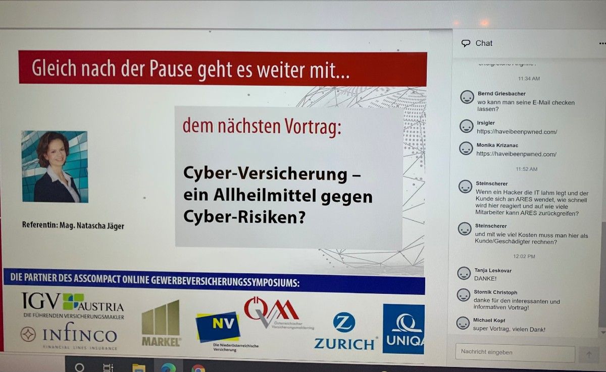 Anschließend beleuchtete Mag. Natascha Jäger, CEO Austria bei COGITANDA, in ihrem Vortrag „Cyber-Versicherung – ein Allheilmittel gegen Cyber-Risiken?“ die Leistungen von Cyber-Versicherungen und erklärte, warum professionelles Schadenmanagement so immens wichtig ist.
