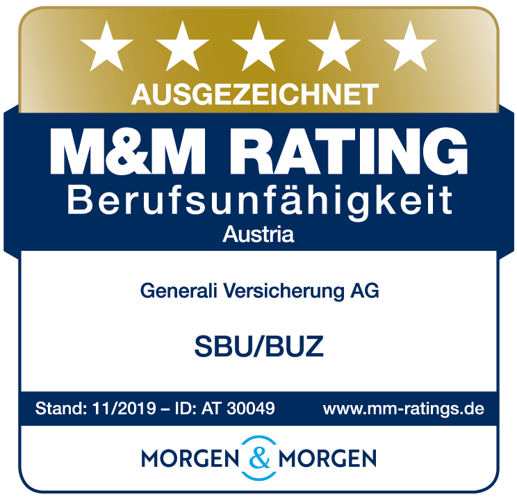Das Analysehaus Morgen & Morgen hat in seinem Berufsunfähigkeits-Rating für den österreichischen Markt die Generali Versicherung erneut ausgezeichnet. Die selbstständige Berufsunfähigkeitsversicherung (SBU) genauso wie die Berufsunfähigkeits-Zusatzversicherung (BUZ) der Generali erhielten im Rating fünf Sterne und die Gesamtnote „ausgezeichnet“.